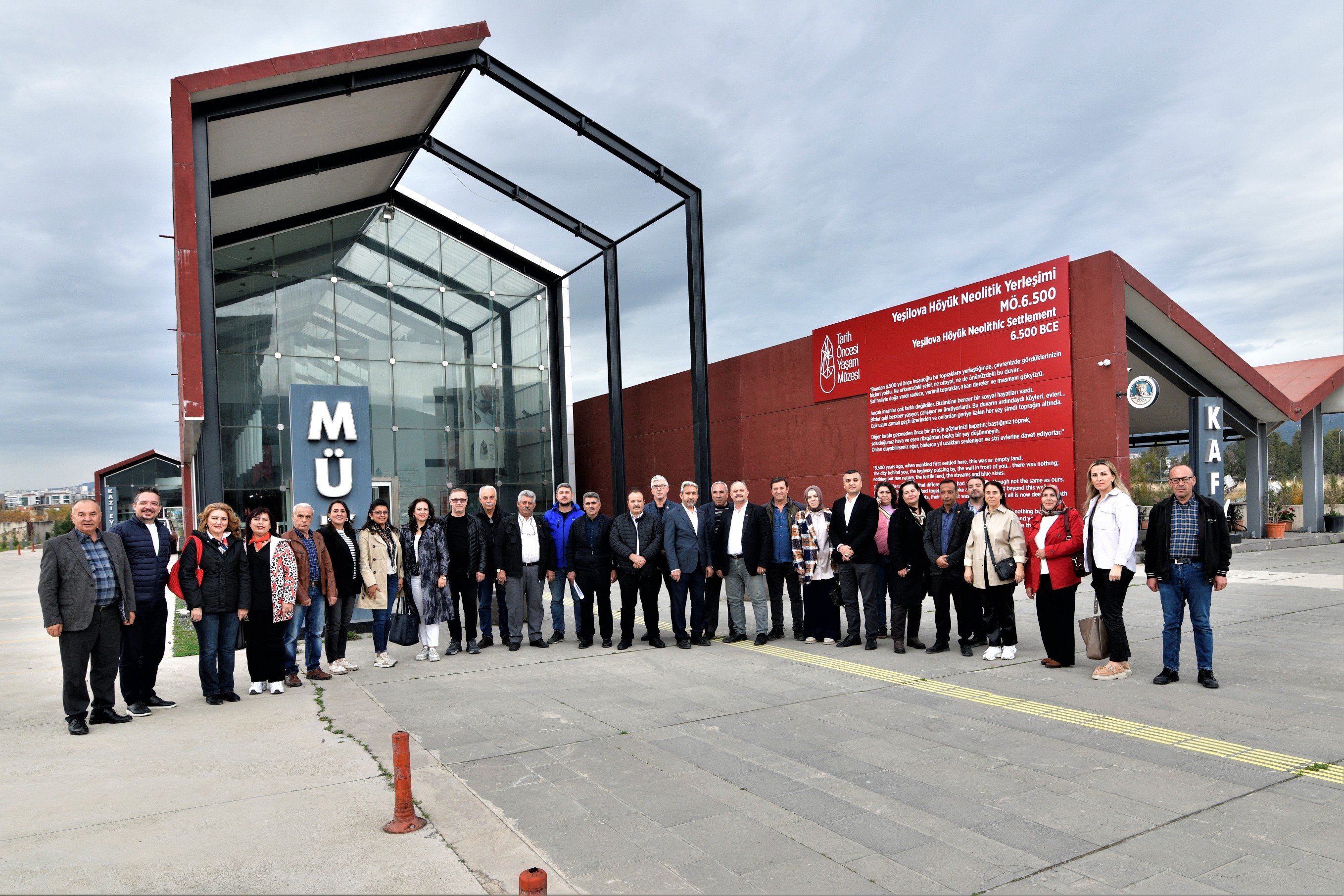 Muhtarlar, İzmir’in 8.500 yıllık tarihine ışık tutan Yeşilova Höyüğü Ziyaretçi Merkezi’nde bilgi aldı.