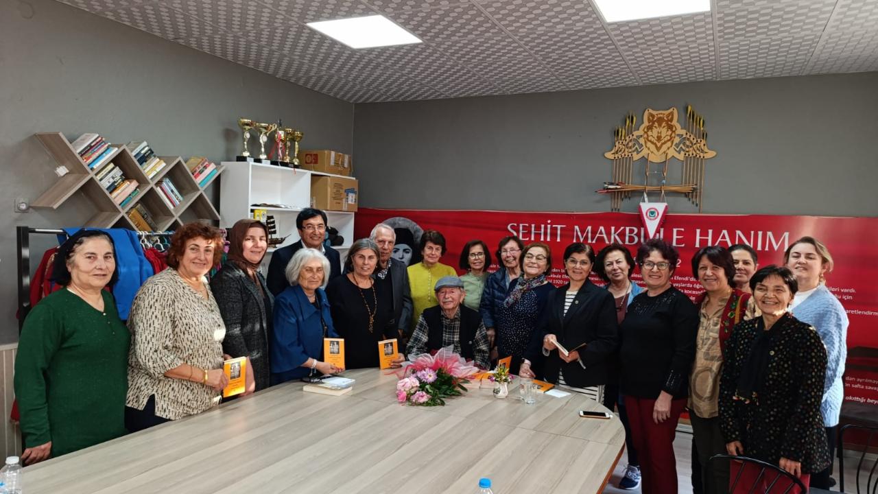 Yapılan söyleşinin ardından Gördes Kültür ve Doğa Derneği Başkanı Emine Ataman Koç yazarlara çiçek takdim etti.