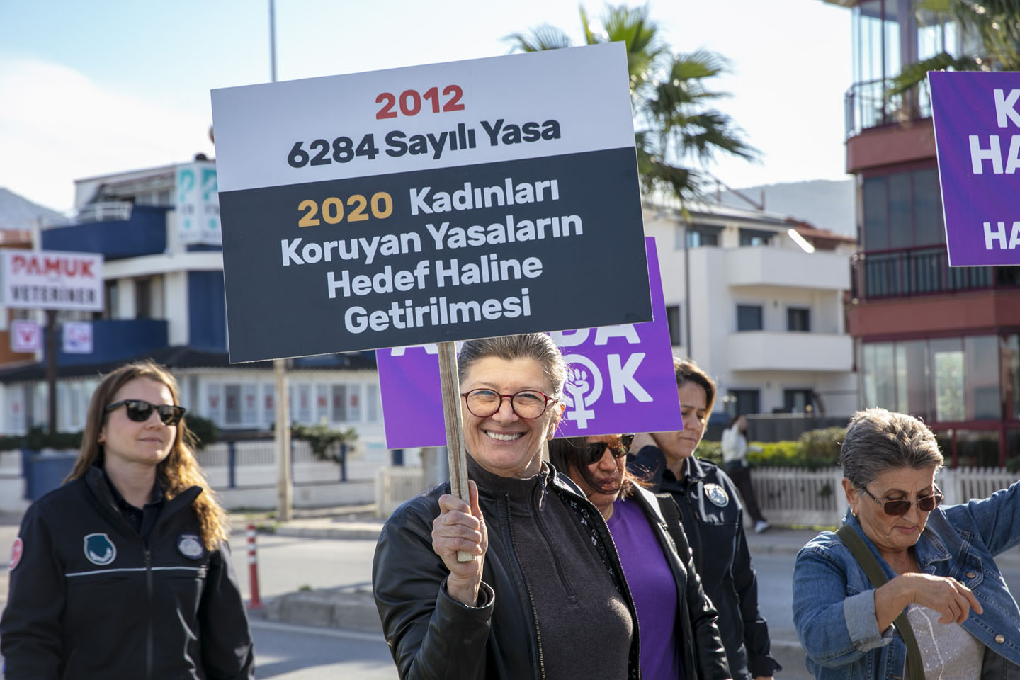 Özgürlük’, ‘Hür Doğdum Hür Yaşarım Kime Ne’, ‘Susmuyoruz Korkmuyoruz İtaat Etmiyoruz’ sloganları attı. Yürüyüşün ardından Güzelbahçe Belediye Başkanvekili Ali Dönmez, Güzelbahçe Belediye Başkanı Eşi Nermin Günay ve Güzelbahçe Belediyesi Kadın ve Aile Hizmetleri Müdürü Duygu Yılmaz beraberindekilerle kadın esnafları ve eşlerini ziyaret ederek günün anlam ve önemi adına hazırlanan çanta ve şiddet karşısında acil alınacak önlemleri içeren not defterini hediye ederek bilgi verdi.