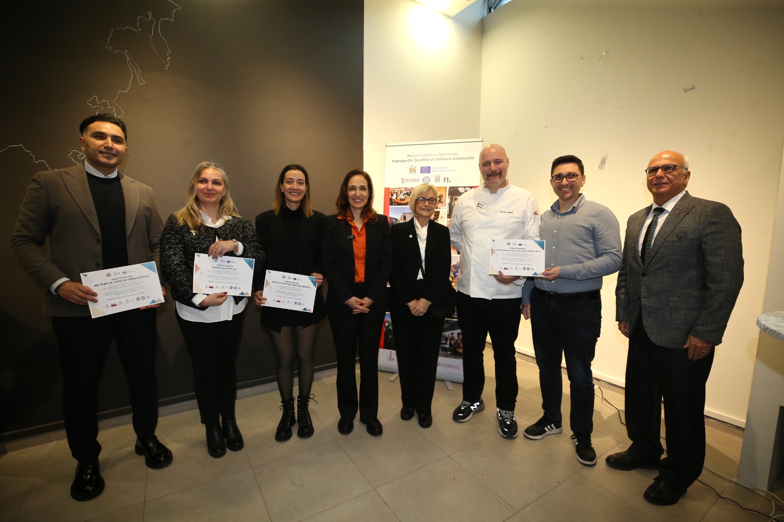 İtalya Ulusal Ajansı tarafından kabul edilen ve İtalya’dan gelen proje ortaklarının da yerinde takip ettiği çalışma, zihinsel engelli bireylerin iş hayatına hazırlanması için geliştirilen ‘Mutfak Becerileri Modülü’nü temel alıyor. Karşıyaka Belediye Başkanı Yıldız Ünsal, Karşıyaka Kaymakamı Özkan Demir’in eşi Dilek Demir ve projeye istihdam desteği sağlayan ISS firması yöneticilerinin katıldığı etkinlikte, eğitim alan gençler hazırladıkları birbirinden lezzetli yiyecekleri konuklara servis etti. Gerçek bir mutfak deneyimi yaşayan gençlerin özgüveni ve profesyonelliği takdir topladı. Eğitim programını tamamlayan çocuklara meslek edindiren proje kapsamında, ISS yöneticileri tarafından 10 gence istihdam sağlanacak. Etkinlik sonunda KAZED Başkanı Tülin Topuzoğlu, projeye sunduğu kapsayıcı destekler ve mutfak alanlarını çocukların kullanımına açtığı için Belediye Başkanı Yıldız Ünsal’a bir teşekkür plaketi takdim etti. Ayrıca projeye katkı sunan Kent A.Ş., Cordelion MSM ve ISS yetkililerine de teşekkür belgeleri verildi.