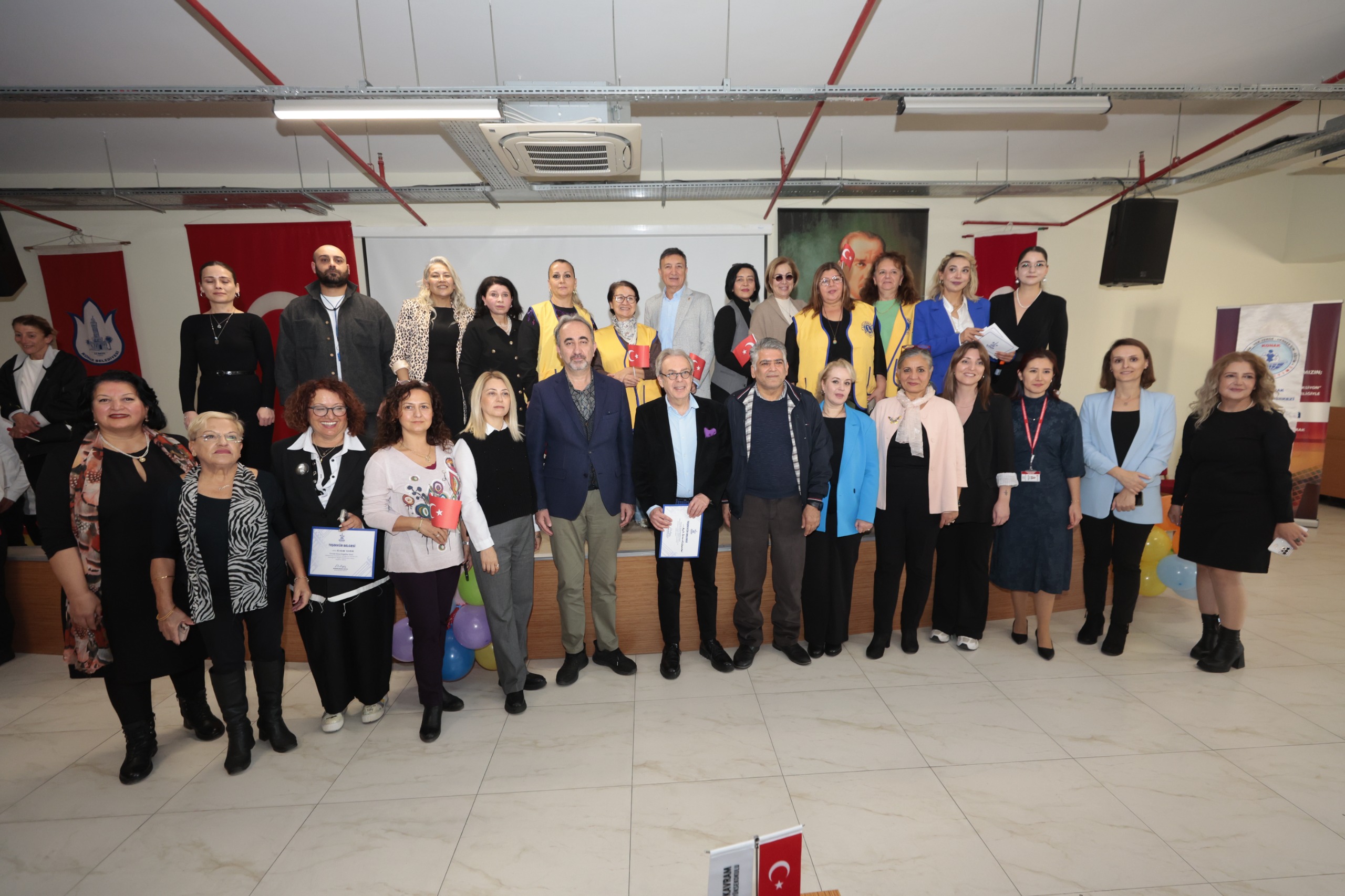 Konak Belediyesi 3 Aralık Dünya Engelliler Günü etkinlikleri kapsamında İzmir Kavram Meslek Yüksekokulu, İzmir Sahne Sanatları Halk Oyunları Spor Kulübü, Konak Halk Eğitim Merkezi, Çiğli Ataşehir Lions Derneği ve Konak Engelsiz Yaşam Köyü işbirliği ile farkındalık etkinliği gerçekleştirdi. Kavram Meslek Yüksekokulu’nun ev sahipliği yaptığı etkinliğe İzmir Kavram Meslek Yüksekokulu Müdürü Prof. Dr. Derman Küçükaltan, Kavram Meslek Yüksekokulu Engelsiz Kavram Koordinatörü Öğr. Gör. Melis Hıdır, Konak Belediyesi Meclis Üyesi Ahmet Yıldız, Konak Halk Eğitimi Merkezi Müdür Yardımcısı Mustafa Ercan Mete, Çiğli Ataşehir Lions Derneği temsilcileri, Konak Engelsiz Yaşam Köyü yönetici, öğrenci ve velileri ile gönüllüler katıldı. Konak Belediyesi’nin engelli bireylere yönelik Konak Engelsiz Yaşam Köyü, Engelsiz Servis, akülü ve aküsüz tekerlekli sandalye temini gibi hizmetlerinin anlatıldığı film gösterimiyle başlayan etkinlikte konuşan Konak Belediyesi Meclis Üyesi Ahmet Yıldız, Konak Belediye Başkanı Nilüfer Çınarlı Mutlu’nun “Eşit katılım ve kapsayıcı yaşam hedefiyle kimseyi geride bırakmadığımız bir gelecek için çalışmaya devam ediyoruz” mesajını iletti.