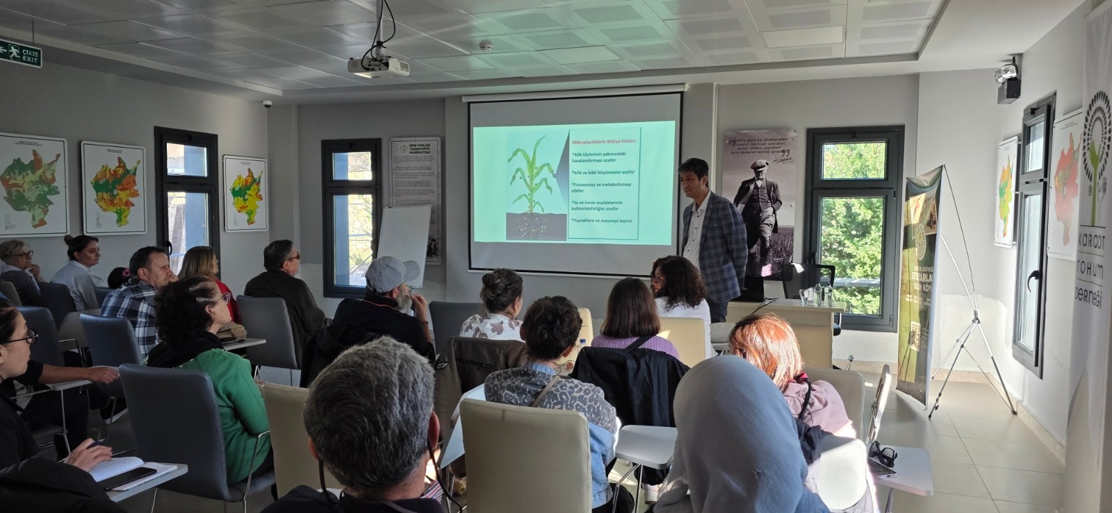 Prof. Dr. Murat Yabanlı, “Plastik kirliliğinin tarımdaki örnekleri” hakkında Toprak Okulu’nda katılımcılara bir sunum yaptı. Yaptığı sunumda plastik kullanımı ve plastik atıklarının canlılar, toprak ve doğa üzerindeki etkileri hakkında bilgi veren Prof. Dr. Murat Yabanlı; “Türkiye 5,5 milyon ton plastik atık ile plastik kirliliği sıralamasında dünyada 9. sırada yer alıyor. Plastik, ucuz ve hafif olması nedeniyle gıda ambalajı olarak sıklıkla tercih ediliyor. Plastik aynı zamanda günlük hayatın ayrılmaz bir parçası olmuş durumda. Bir plastik poşetin 20 yılda yok olduğu söyleniyor ama yok oluş söz konusu değil aslında. Plastikler giderek ufak parçalara dönüşüyor en sonunda nano plastik parçalar kalıyor. Bu parçaların doğada hareketi devam ediyor. Gözle görülmeyen plastiklere mikro plastik adını veriyoruz. Her yıl 8 milyon ton plastik denizlere karışıyor. Denizlere karışan plastik denizlerdeki canlı yaşamını da olumsuz etkiliyor. Tüm bunların önüne geçmek için tek kullanımlık ürünleri hayatımızdan çıkarmalıyız. Plastik su şişeleri yerine matara kullanımı yaygınlaşmalı, geri dönüşüm bilinci kazandırılmalı. Plastik poşetler yerine bez torbalar kullanılmalı” bilgisini verdi.